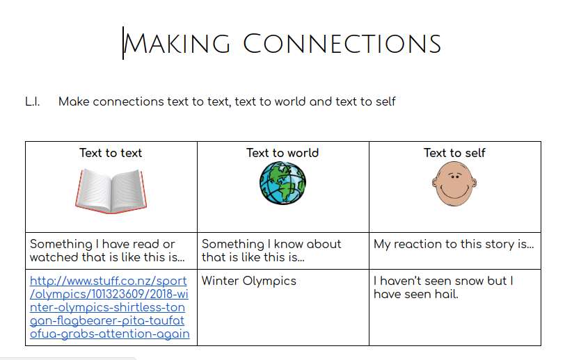 Today for Reading I did Making Connections. I have learnt something about the Winter Olympics and about snow and hail. We wrote about the Winter Olympics. We had to find a site that was about (shirtless Tongan flag bearer). Then we had to put the link on (text to text). The next thing we did was text to world. We had to write what do we know about it. So we all wrote Winter Olympics because that was the only thing we all knew. The last thing we did was text to self. We had to write our reaction to the story.
